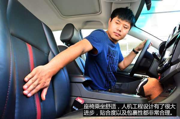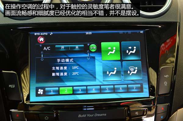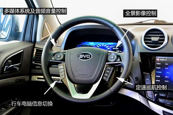 12英寸宽的超大纯液晶仪表盘的显示效果还是十分出色的,不仅界面足够炫,可显示的内容也十分丰富,这是比亚迪的拿手好戏。10.2英寸的中控液晶屏十分显眼,中间横穿的银色饰条很好的分割了仪表台的上下两部分。方向盘握感厚实,多媒体按键很丰富并且采用中文标识,做法值得提倡。