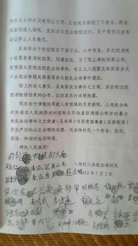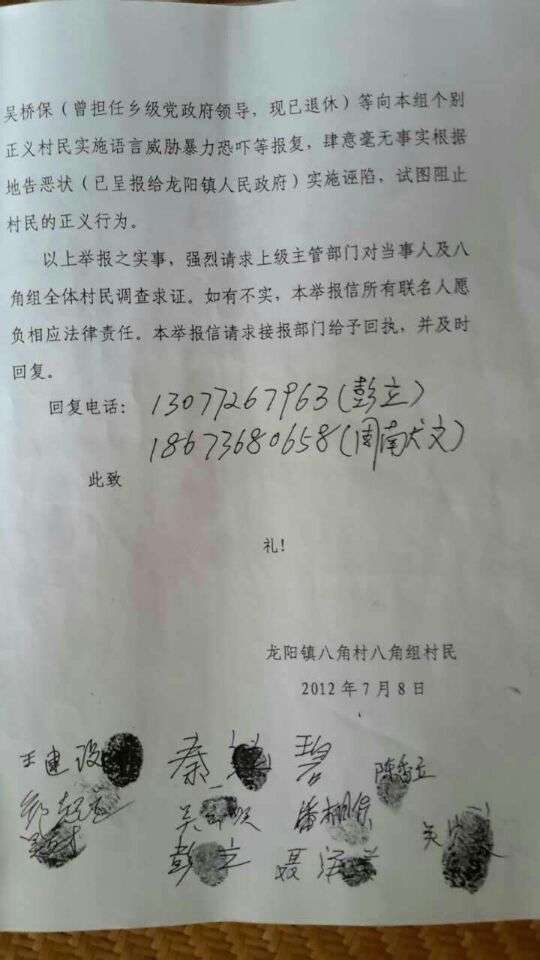 杨昶书记:近日我尚在南宁出差,却收到贵县八角村村民通过邮箱发给我的两个有关举报该村支书吴来宝的举报网帖链接,我点开链接看完材料后,发现这两个网帖发布的时间是两年前的2014年9月和10月,既然是“历史帖”,我看后就放下了,谁知接下来举报者加了我的qq,开门见山地请我支持反腐“拍蝇”,让上级有关部门拍下他们村里的“苍蝇”——村支书吴来宝。原来,八角村村民于2014年实名举报吴来宝后,虽然县领导责成龙阳镇政府成立了三个专项工作组调查吴来宝的问题、核实举报内容,但调查过后便没有结果了,时至今日也没得到任何回复。故此,八角村村民表示绝不会放过吴来宝这只危害百姓的“苍蝇”,他们希望我替他们鼓与呼。作为反腐与维权博客,这是我愿意做的事情,但村民的举报和我的“助威”,仅仅是一种声音,而不是行动,故此,我希望和拜托杨昶书记重视八角村村民的诉求,通过您的发力将村民反腐的声音化为反腐行动,尽快重启对吴来宝的调查,为我们的反腐事业助力!