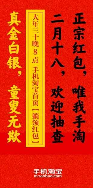 为了融入这新“习俗”,唐狮作为时尚休闲服装品牌也起表率作用,率先联手手机淘宝给全民发红包,据悉红包金额超过百万,并且都是真金白银。这次推出红包活动是春节对消费者的回馈,希望通过以应景的春节红包为载体,加强和消费者彼此之间的沟通,给消费者更直观的消费体验。从手机淘宝躺领红包活动将于