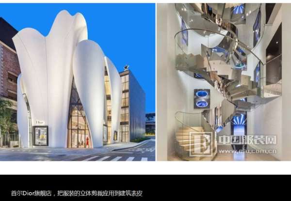 这个是韩国首尔迪奥的专卖店,它整个的建筑设计,外面的和室内,我个人认为是非常有科技感的一种结合,非常的漂亮。这是现在不得不提3D打印技术,这是3D打印快闪店,3D打印快闪店的一个,可以组装、可拆卸,非常轻便,非常环保,这是一个我们看到,现在3D很广泛应用,包括服装上。但是我个人看了,还是一个尝试阶段,还没有达到我个人刚才提的观点,就是它能够和服装、和时尚能够更完美的结合,或者说这不仅仅是日常的生活穿着的需求,我觉得它除了这种艺术审美之外,不能被日常审美接受,应该说还是在尝试阶段。这个像3D打印一样,我相信通过五年,十年以后,一定会在服装或者在这个时尚这个领域,能够更美好,更完美的结合。那这些东西,我相信作为一个时尚专业领域的学生需要去了解,需要去涉猎,至少我们要知道世界发生了什么样的变化,出来一些什么新的东西。