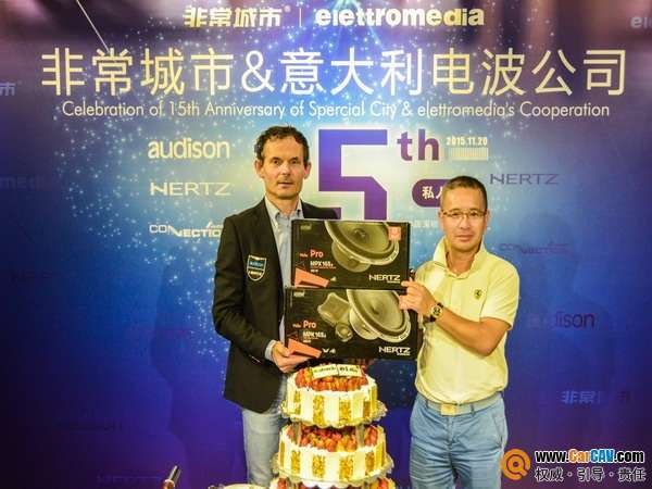 非常城市董事长吴杰和意大利电波全球销售总监Leonardo共同展示他们合作十五周年纪念喇叭:赫兹Mille系列竞技产品MPK 165.3 PRO、MPX 165.3 PRO