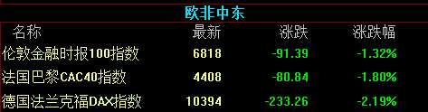 欧洲各国股市也均出现了较大幅度的下跌,其中德国DAX 30指数下跌2.2%,报收于10393.71点,创下自6月27日以来的最大单日跌幅。法国CAC 40指数下跌1.8%,报收于4407.85点。英国富时100指数下跌1.3%,报收于6818.04点。