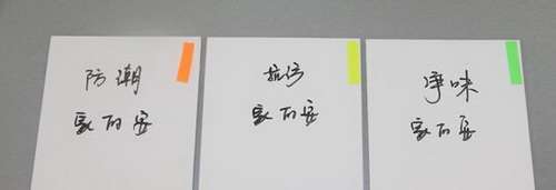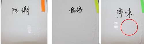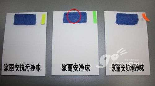 实验步骤和目的:在多乐士家丽安系列板上用记号笔写分别写上字样,我们将多乐士家丽安净味、多乐士家丽安抗污净味、多乐士家丽安防潮净味墙面漆分别加