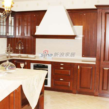 有一句戏言,“了解一个家庭的生活幸福指数,先看他们的厨房”,进入这样的厨房,一种古典贵族气息扑面而来。整个橱柜暗红色的色调、樱桃木实木边框,精致的花纹,复古的把手,整体感觉古典自然。
