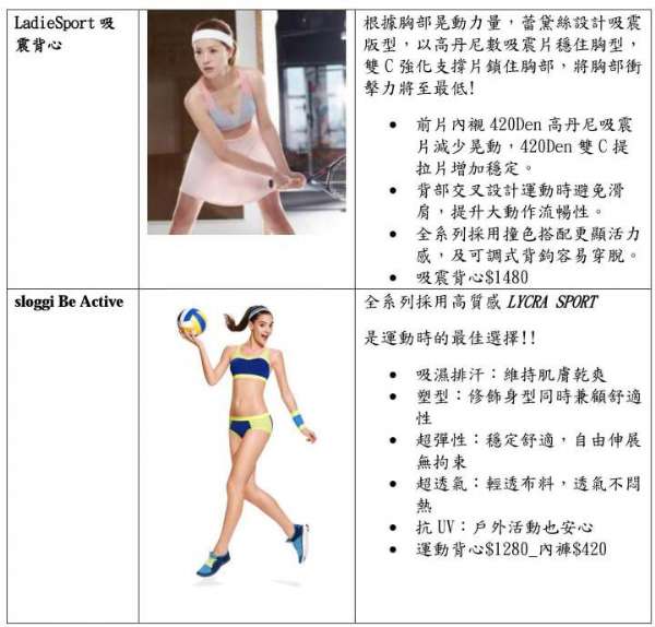 黛安芬夏季推出「動生活」系列,主打舒適無痕,暢銷款全新「身體底妝」採用呼吸纖維罩杯搭配彈性透涼棉,從裡到外空氣循環無阻礙,體內濕氣流通排出,不再悶熱一身汗!蕾黛絲則推出「LadieSport」運動系列,將運動內衣依運動需求分為四級,減緩過度胸部震動,提升運動效果!全系列採用3倍瞬吸棉,採用吸濕快乾材質增加透氣性,休閒、運動都舒爽,且版型再升級,滿足大胸包覆,小胸穿著有胸型的運動需求,讓女性運動多了更多選擇!