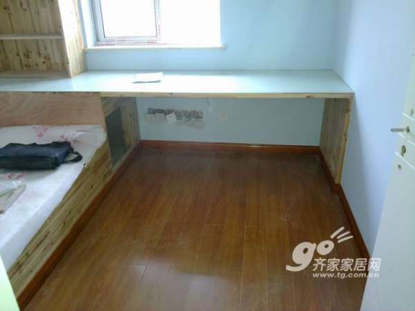 卧室的地板,墙面是淡蓝色+白色的。