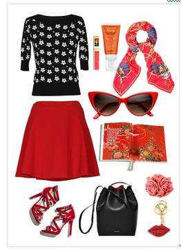 搭配二:下身搭配大红色A版短裙,青春洋气,气质减龄~~