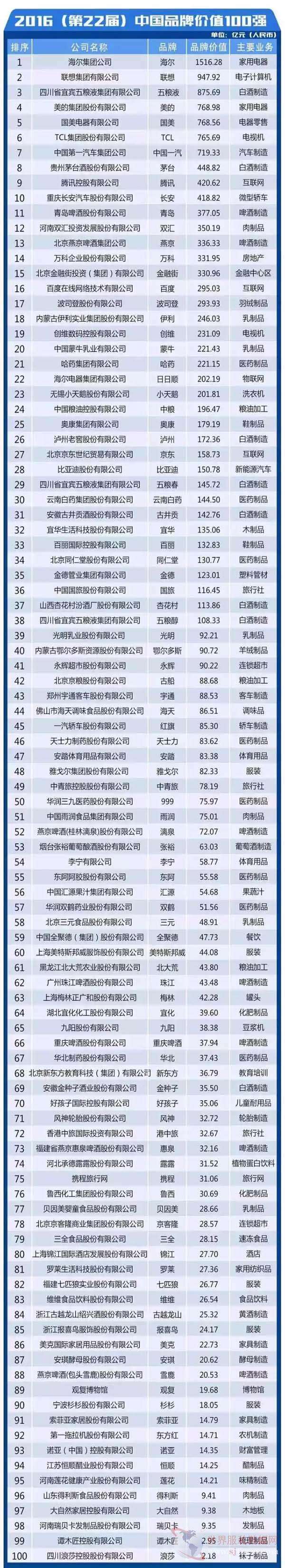 海尔、联想、五粮液分别以品牌价值1516.28亿元、947.92亿元、875.69亿元,位列2016中国品牌价值100强榜单前三位。包括