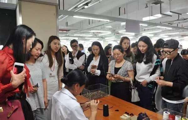 雅莹总部的供应链制造工场分为精品工场、外套工场、连衣裙工场、裙裤工场,嘉宾们进入车间,见到了整齐码放的各种零布料。雅莹的工匠精神,在整个精品工场中随处可见,许多拥有几十年技艺的老师傅穿针引线,现场缝制衣料,那些看似不经意的领口袖口,都是老师傅纯手工缝制。一件小小的衣领钉珠,一个师傅一天只能缝制三件。