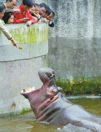 成都动物园,几位市民用橘子皮喂河马。 (资料照片)