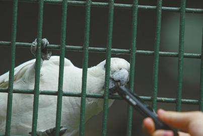成都动物园,一位游客用圆珠笔挑逗鹦鹉。