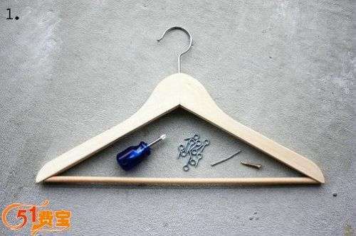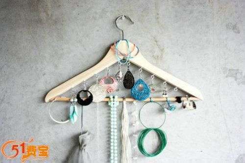 这个实际上跟开篇的眼影盒有些相似,只不过不是用晒架,而是用的木制衣架和挂钩螺丝,做成以后一些不好收纳的小饰物如毛衣链、耳环、腰带等,都能挂在上面,是不是方便又有个性?