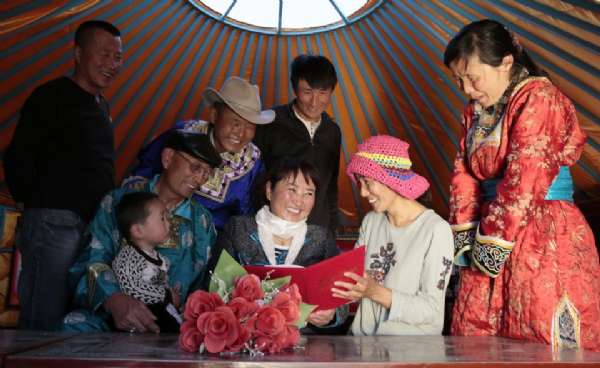 因为辖区牧民恩克门德勤俭持家,而且家里家外收拾的井井有条,受到邻里的称赞,萨仁其木格和附近的牧民来到她家,为她颁发“齐布日艾力(汉语是干净人家的意思)”奖状。