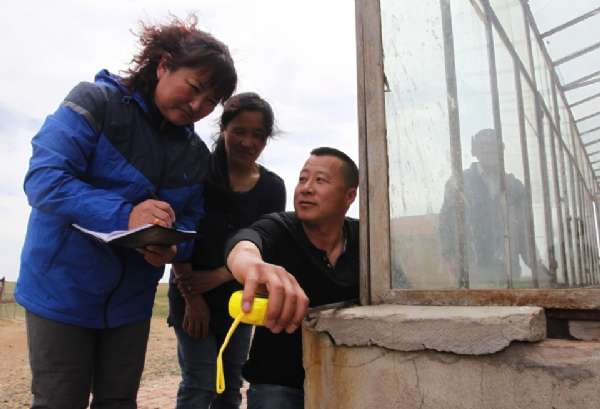 萨仁其木格正在记录为乌力吉巴图家丈量将要翻修的房屋面积。