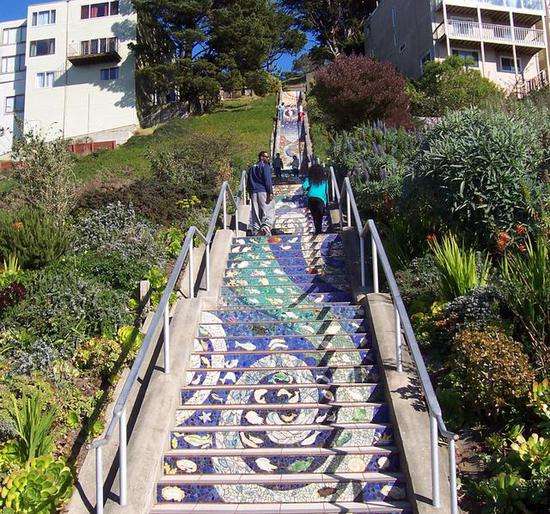 彩色瓷砖拼接而成的阶梯,有没有被它惊艳到?这段Tiled Steps位于旧金山第16街,由太阳、星星、月亮、银河组成的色彩缤纷的阶梯共有163个阶梯,是艺术家Aileen Barr and Colette Crutcher带领社区居民一起花了2年时间完成的。