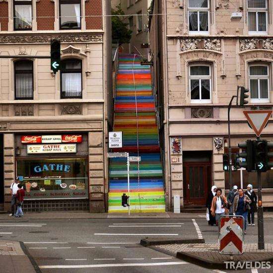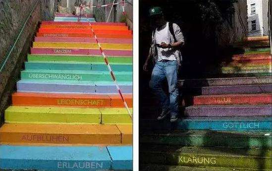 德国伍珀塔尔市的Holsteiner阶梯有112级台阶。远看就像一条五彩斑斓通往天国的阶梯,近看每级台阶上都印有文字,含义是“恐惧、爱、信任、绝望、希望”等描绘人性的词,顿时丰富了台阶的深意。
