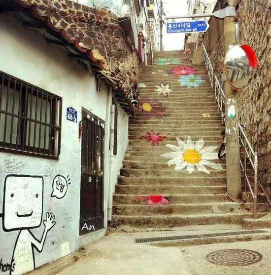 梨花洞是一个居民住宅区,经常看韩剧的妹子们一定对壁画村不会陌生,《屋塔房王世子》中男女主人公就经常在这里约会。这里的台阶无处不在,胡同里都被艺术家们的各种壁画填满,到处都充满着惊喜。
