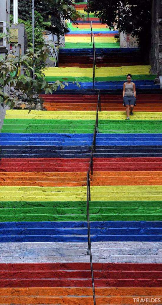 这段让人着迷的彩虹阶梯位于伊斯坦布尔市区,阳光明媚的日子,踏上这段阶梯,仿佛可以通往一个梦想中的美丽新世界。