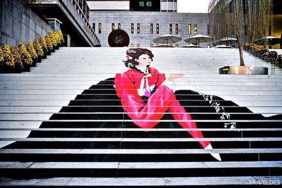 当时为了宣传一部韩国音乐剧,通往音乐厅的台阶上被画上了穿着传统韩服的女人。台阶将近大远小的效果表现得淋漓尽致。