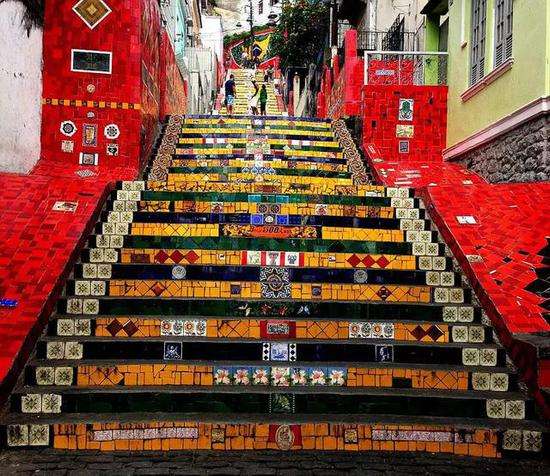 里约的这段阶梯由艺术家塞拉隆用来自60多个国家和地区2000多彩色瓷砖镶嵌而成,连阶梯两侧的墙壁也贴满了瓷砖拼成的艺术画,用以向巴西人展现敬意。