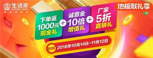 有一种活动叫“地板献礼季”;有一种劲爆叫豪礼享不停、惊喜全天有;有一种震撼叫新品来袭、折上折;有一种期待叫全城惠动、一促即发。生活家地板“地板献礼季”感恩特惠提前引爆,惊喜豪礼全天开启,让你提前享受双11,你准备好了吗?