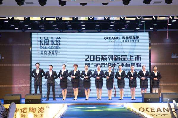 经销商团队展示了其专业的一面。漯河欧神诺营销中心总经理李勇先生介绍了欧神诺的品牌、产品线以及服务力。团队成员以整齐划一的团队展示与设计师们产生互动。