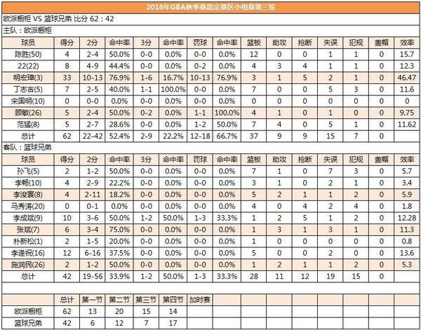 欧派橱柜3号明宏璋拿下33分3板1助攻5抢断,篮球兄弟16号立李逢祝拿下12分5板。