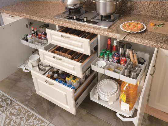 拉篮、台面、隔板设计好坏直接影响整个橱柜的收纳能力,进而影响整个厨房的空间,只有让拉篮、台面、隔板设计都恰到好处,才能让您的厨房空间得以扩充。