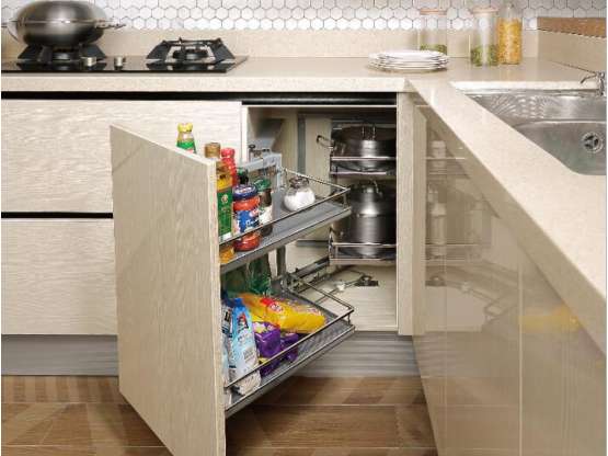 在橱柜转角处设置拉篮,可以最大程度利用死角空间,轻拉轻推之间就可以扩充厨房面积。无论是转动篮架还是抽拉活动式的双层收纳都能够极大地扩充厨房空间。
