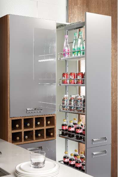 竖长的窄形拉篮,其狭长的储物空间非常适合存放灌状或瓶状的物品。富有层次的抽拉式侧面窄抽屉,将橱柜的角落空间利用起来。