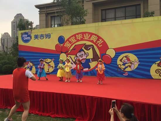 4点半,毕业典礼准时开始啦!美吉姆早教中心的老师们穿着红色的球衣,开始了暖场的表演,为现场增添了活跃的气氛,宝宝们的羞涩一点儿一点儿的不见了,都愉快的跟着节奏在观众席手舞足蹈。