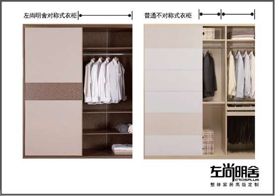 市面上普通定制的移门衣柜,大多采用单元柜组合的方式实现柜体宽度的变化。例如,有A、B、C三种单元柜,B柜的宽度可调节,只要改变B柜的宽度就能应对客户对整个柜子宽度定制的需求,其他单元柜是固定的。这样再装上移门,很容易产生推开门却有一截柜子空间被门挡住的尴尬,既不美观又不方便。而左尚明舍绝不能容忍对此将就,他家的柜子没有几个单元柜组合之说,属于完全的量身定制,从而实现柜体完全等分。只要轻轻推开移门,就能100%呈现柜内空间,衣物一目了然,毫无死角。这项技术也是高级定制的标志之一。