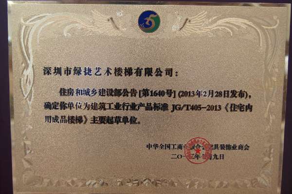 2009年7月8日绿捷楼梯参与住房城乡建设部和全国工商联家具装饰业商会楼梯专委会、各专家起草和制定《住宅内用成品楼梯》行业标准,规范行业良性发展工作,该标准的制定工作历时三年多,先后召开六次标准起草会议,在深入调查研究,广泛征求了各方意见的基础上,形成终稿报至住建部待批。2013年2月28日住建部正式发布标准并于2013年6月1日实施此标准。标准号为:JG/T 405-2013。作为建筑工业行业楼梯产品最高级别标准,本标准的出台对我国楼梯行业具有重要的意义,以带领楼梯企业加强标准学习和技术交流,提升楼梯产品规范化生产。这标志着中国楼梯行业进入标准化时代。