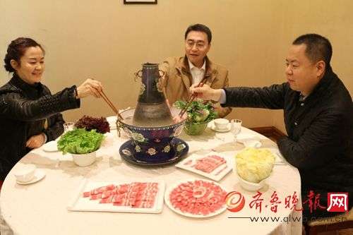 三名客人围着东来顺特有的景泰蓝火锅品尝正宗内蒙羊肉