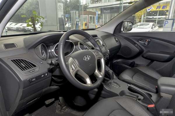 内饰方面,作为小改款车型,现代ix35更加强调运动性并且沿用了外观部分线条感思路,这点从方向盘和炮筒式设计的仪表都可以看出来。现代ix35方向盘是典型的现代设计,四幅式方向盘银色装饰从多功能按键处一直延伸到最底部,多功能按键的功能控制也相当丰富,增加了操控的便利性。现代ix35的中控台整体呈圆弧设计,并提供两种(米灰色和全黑色)内饰风格供消费者选择,从色彩运用角度来说,现代ix35内饰设计非常具有时代气息。