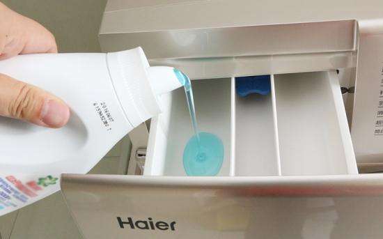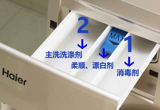 在滚筒洗衣机正面左侧顶部,安装了洗涤剂分配器盒,它们分别为主洗洗涤剂;软化剂、漂白剂;还有消毒剂。洗涤剂用量不宜过少、过多。根据衣物量及分配器MAX标识进行合理分配。