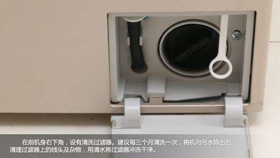 在机身右下角设有排污过滤口,可收集洗衣过程中的毛屑污垢。如洗涤中突然停电,可由此强制开启舱门。