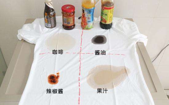 首先,在棉质T恤的四个位置均匀涂抹咖啡、酱油、辣椒油和果汁,待污渍充分附着在衣物上,将衣物放置于内筒中,并添加配重衣物和普通洗涤剂。