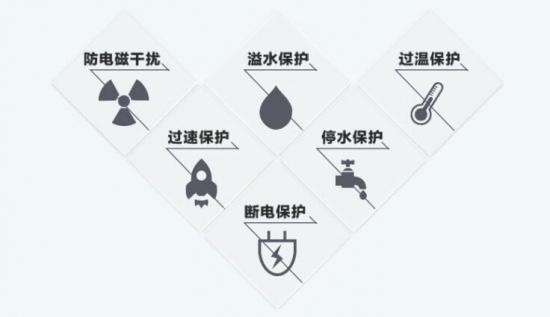 除了智能应用外,家电安全问题也不容忽视。使用这款洗衣机您就大可放心,在断电、停水、溢水、过热、过速和防辐射等问题上,提供了多项智能保护,呵护衣物同时也确保家人不受侵害。