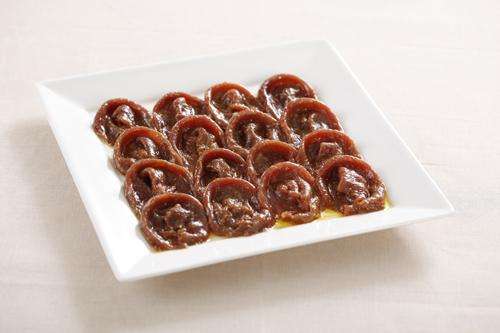 选用羊里脊去筋络,切片、配以本店独家传统配方密制而成。