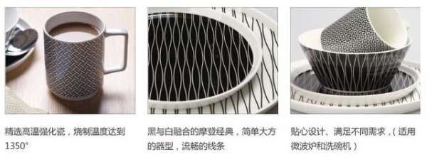 尺寸/规格:6寸V型碗黑1只,10寸平盘白1只,7寸平盘黑1只,大杯+碟白色1组,直身奶杯1只。