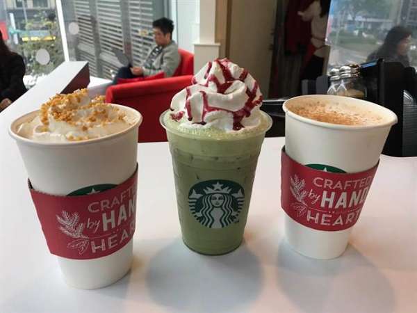 耶誕期間限定飲品,由左至右為「太妃核果風味那堤」、「紅絲帶抹茶那堤」及「燕麥焙香那堤」,依容量售價135至170元不等。(徐力剛攝)