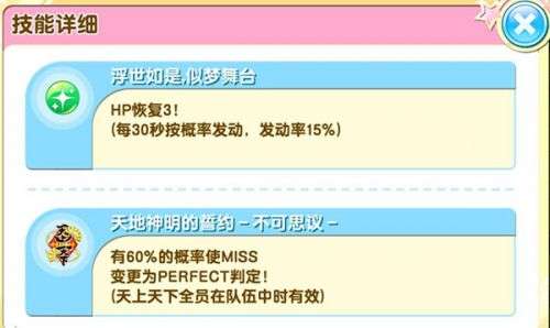 这种技能就是直接按照系数对技能发动期间的节拍得分进行加成的技能。发动条件主要是:每达到卡牌要求的连击次数时发动的加成、每达到一定次数的Perfect时发动的加成以及每经过规定时间后按照一定几率发动的加成。