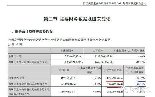 10月29日,贝因美(002570.SZ)在深交所递交了2016年第三季度报告,营业收入约为18.3亿元,和2015年同期约为26.44亿元相比,下滑30.79%;归属于上市公司股东的净利润约为-4.09亿元,同比跌幅高达89.45%,收入、盈利双双下滑。