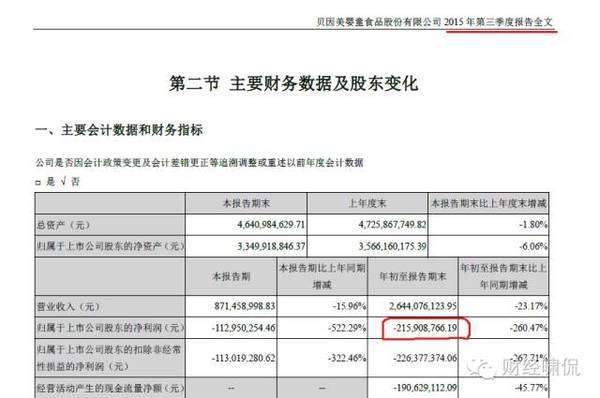 2015年前三季度,贝因美同样报亏,归属于上市公司股东的净利润约为-2.15亿元,但利用2015年第四季度,贝因美竟神奇地扭转了亏损局面,全年归属于上市公司股东的净利润约为1.04亿元。
