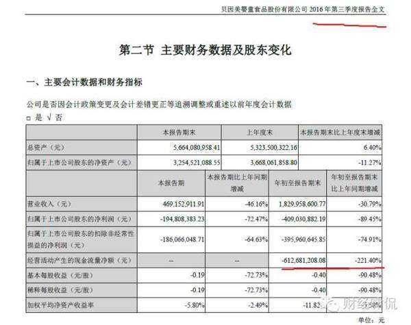 《财经啸侃》特约、独家撰稿人五谷君注意到,2016年前三季度,贝因美经营活动产生的现金流量净额为负数,约为-6.13亿元,和2015年同期约为-1.91亿元相比,跌幅高达221.4%,呈现明显扩大趋势。