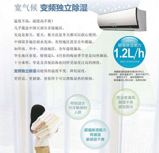 三菱电机1.5匹全直流变频1级能效壁挂式冷暖空调(黑色)MSZ-PAHJ12VA拥有宽气候变频独立除湿功能几乎覆盖中国大部分多湿地区,无论是春夏秋冬都可以放心使用,同时,变频独立除湿功能在除湿过程中保持室内温度不变,吹出室内温风不再感觉到冷,特别适合冷敏感的人群。