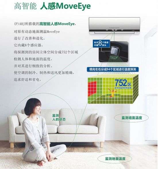 (黑色)MSZ-PAHJ12VA搭载的高智能人感MoveEye对原有的动态地面测温系统进行了改善和优化,它内藏8个感应器,将探测到的房间环境分成752个区域,监测人体和地面温度,并对其进行细致的分析,即时进行气流控制,有效解决生活空间温度不均匀、冷暖差异等问题,相对于没有MoveEye的普通空调产品节能30%。