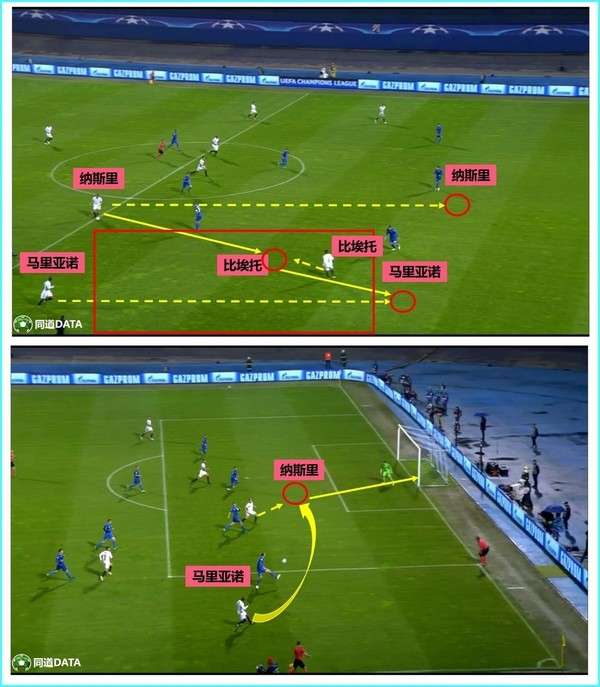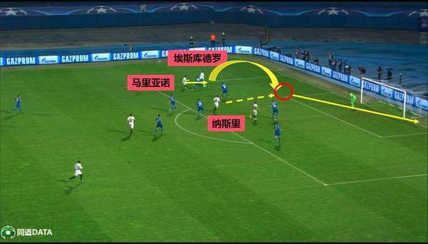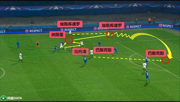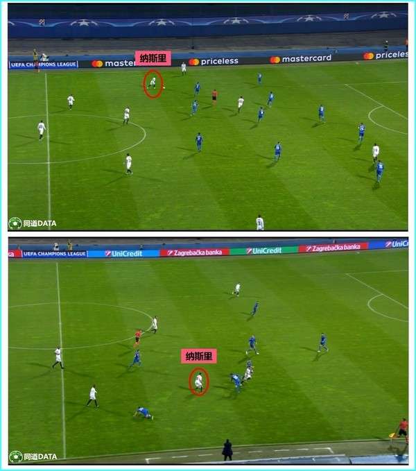 以上图为例,在萨格勒布迪纳摩三名防守队员的围抢下,闲庭信步的将球带出包围圈,与比托洛做二过一撞墙配合后,将球分给左路套边插上的埃斯库德罗,得球后的西班牙人将球传至中路,巴斯克斯完成头球攻门。威胁进攻的源头正是源于纳斯里出色的脚下技术和灵活的拉边跑位。