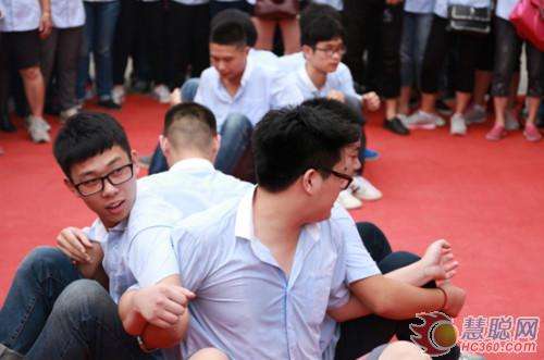 首先进行的是团体赛:男子组举行的是坐地起身节目,各司派7人代表参加,4人一组,手臂勾手臂围成一圈,背对背的坐在地上,在不用手撑地的情况下站起来;随后依次增加1人坐地后站起来,直至增加到7人全部站起为胜。